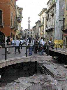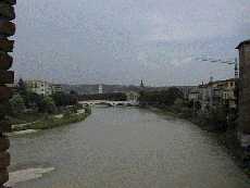 左の写真はアリーナでのオペラを伝えるポスター、右は橋の上から撮ったこの街を通るアディジェ川です。