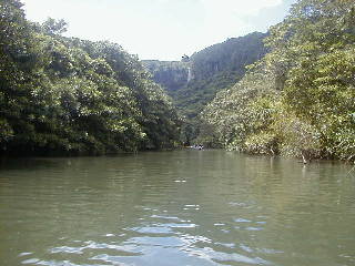 写真では少し判りづらいかも知れませんが、正面の山の頂からの白い線が沖縄で一番の落差を誇るピナイサーラの滝です。