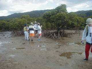 ツアーの終盤、引き潮で干上がった汽水域(きすいいき)と呼ばれる淡水と海水が混じり合う場所を少し歩きました。ここでマングローブとその周りの動物たちを案内していただきました。