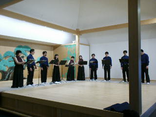 リハーサルでの能舞台に勢揃いした「アウローラ・ムジカーレ」です。手前の柱の前が「特別席」(?)ですね。