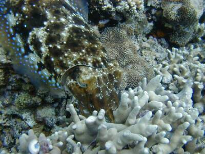 このコブシメの卵って珊瑚の枝と枝の細い間に産み付けられるんですね。