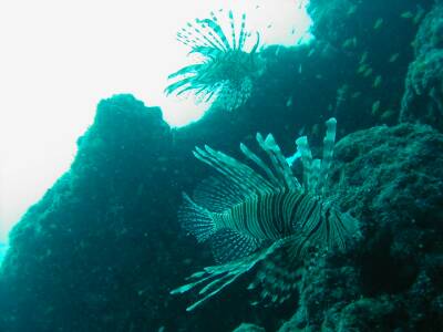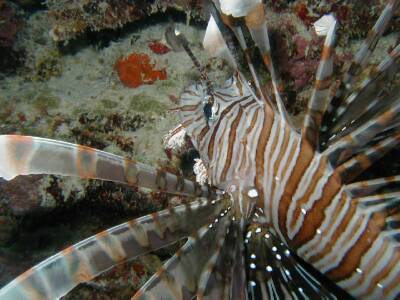 この深さでよく見られる「ハナミノカサゴ」です。針に毒があるので近づけないのですが、ギリギリまで我々は近寄っていきますね。(笑)