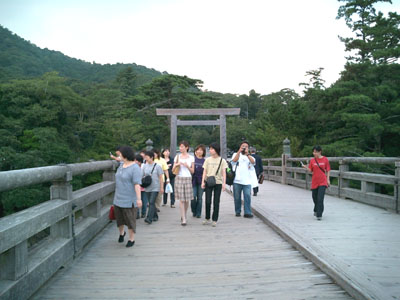 内宮の大鳥居をくぐって宇治橋を渡る団員達です。