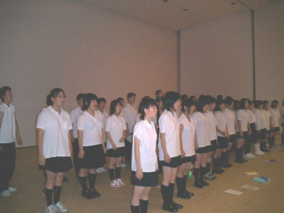 ホールでは、依頼しておいたのですが、響きを確かめるために歌ってくれる合唱部の人たちが舞台でお出迎えです。